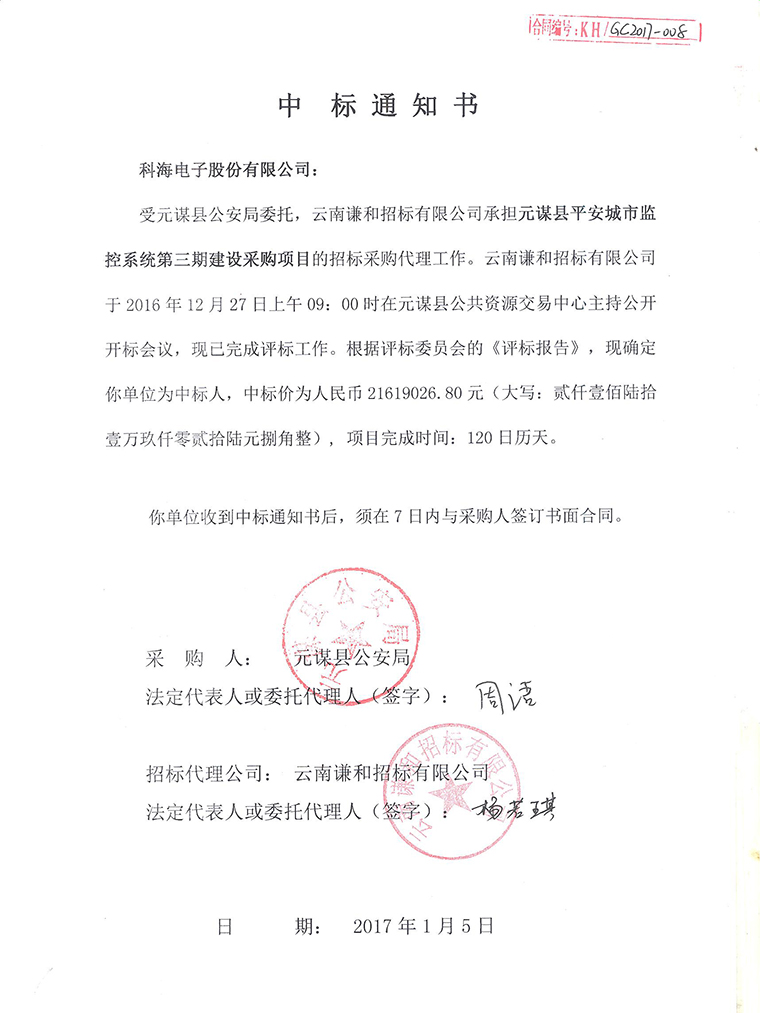 正值寒冬季節(jié),美麗的昆明依然陽(yáng)光普照、溫暖如春,我公司也如同這燦爛的天氣一般,在年末收官之際頻獲喜訊??坪k娮庸煞萦邢薰驹俅螒{借著雄厚的技術(shù)力量和良好的信譽(yù)于2016年12月28日順利中標(biāo)“元謀縣平安城市控系統(tǒng)第三期建設(shè)采購(gòu)項(xiàng)目”,中標(biāo)金額:21619026.80元。