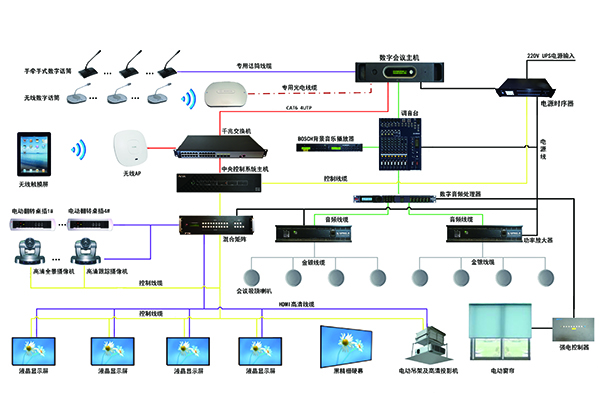 數(shù)字會(huì)議系統(tǒng)包括智能中央矩陣控制系統(tǒng)、無線觸摸控制系統(tǒng)、數(shù)字會(huì)議系統(tǒng)、音頻擴(kuò)音系統(tǒng)、自動(dòng)跟蹤攝像系統(tǒng)、大屏幕顯示系統(tǒng)以及網(wǎng)絡(luò)視頻會(huì)議系統(tǒng)、智能照明控制系統(tǒng)等。