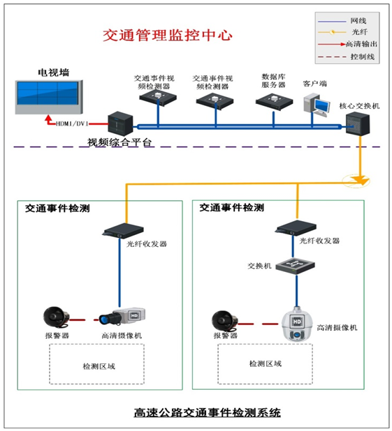 高速公路交通監(jiān)控系統(tǒng)其主要功能是借助現(xiàn)代交通流觀測、誘導與控制的相關(guān)理論,并利用計算機技術(shù)、閉路電視監(jiān)視技術(shù)、信息多媒體技術(shù)等領(lǐng)域的科技發(fā)展成果,對高速公路的交通運營狀況、車輛行駛情況以及道路環(huán)境狀況進行全面觀測,并對沿途車輛的行駛路線、行駛方式進行有效誘導與控制。