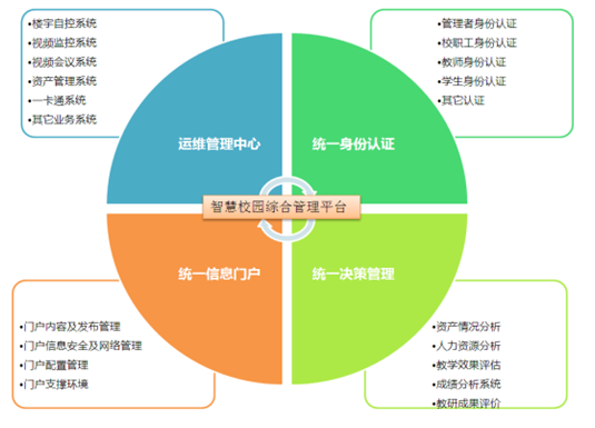 信息化管理平臺對各子系統(tǒng)資源的整合、優(yōu)化、分析并對校園組織和業(yè)務(wù)流程進(jìn)行再造,推進(jìn)校園制度創(chuàng)新、管理創(chuàng)新和服務(wù)創(chuàng)新,實現(xiàn)教育管理的信息化、決策的科學(xué)化、管理的規(guī)范化。