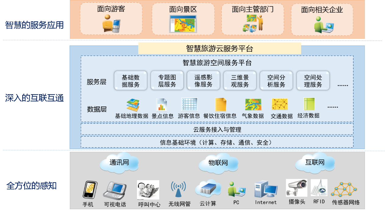 豐富的空間資源:基于多源基礎(chǔ)數(shù)據(jù)、旅游業(yè)務(wù)數(shù)據(jù)、空間感知和監(jiān)測(cè)數(shù)據(jù)、公眾自發(fā)提供的數(shù)據(jù),及其它通信、交通、氣象等部門(mén)的實(shí)時(shí)信息,面向旅游資源管理和運(yùn)營(yíng)的方方面面提供專(zhuān)題化的空間數(shù)據(jù)產(chǎn)品。